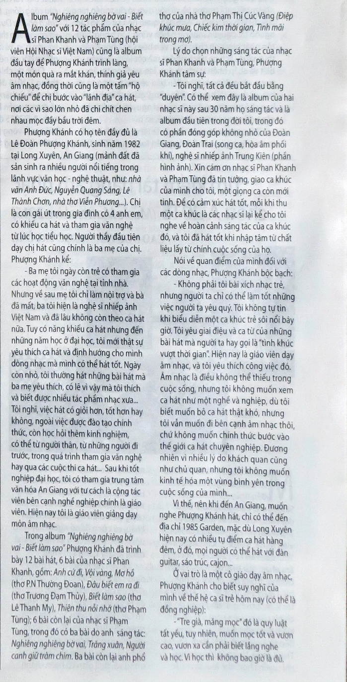 Album “Nghiêng nghiêng bờ vai - Biết làm sao” với 12 tác phấm của nhạc sĩ Phan Khanh và Phạm Tùng (hội viên Hội Nhạc sĩ Việt Nam) cũng là album đầu tay để Phượng Khánh trình làng, một món quà ra mắt khán, thính giả yêu âm nhạc, đồng thời cũng là một tấm “hộ chiếu” để chị bước vào “lãnh địa” ca hát, nơi các vì sao lớn nhỏ đã chi chít chen nhau mọc đầy bầu trời đêm.